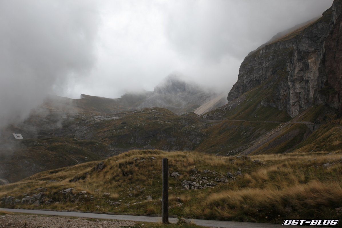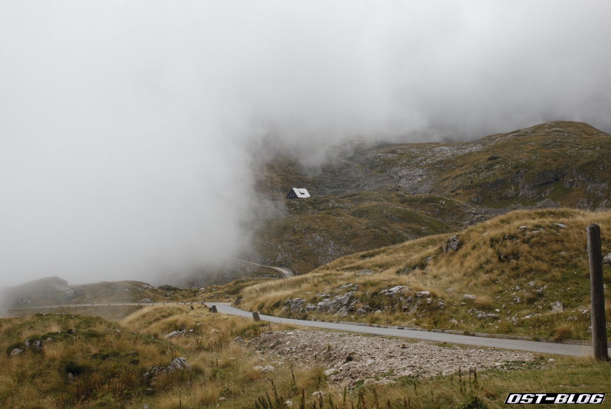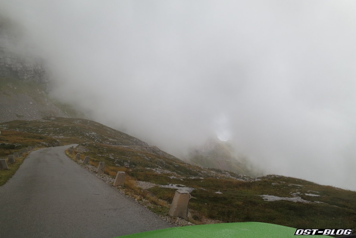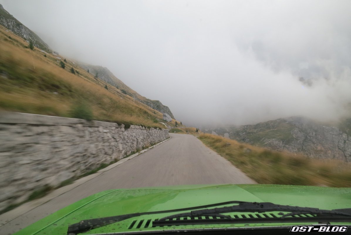 Also weiter. Denn ein großes Ziel hatten wir noch vor uns. Die Mangartstraße, die hinauf zur Lahnscharte und dem Fuße des Mangarts führt. Es ist die höchste Straße Sloweniens und wohl bei unserem Besuch wohl auch die mit dem fiesestem Wetter.