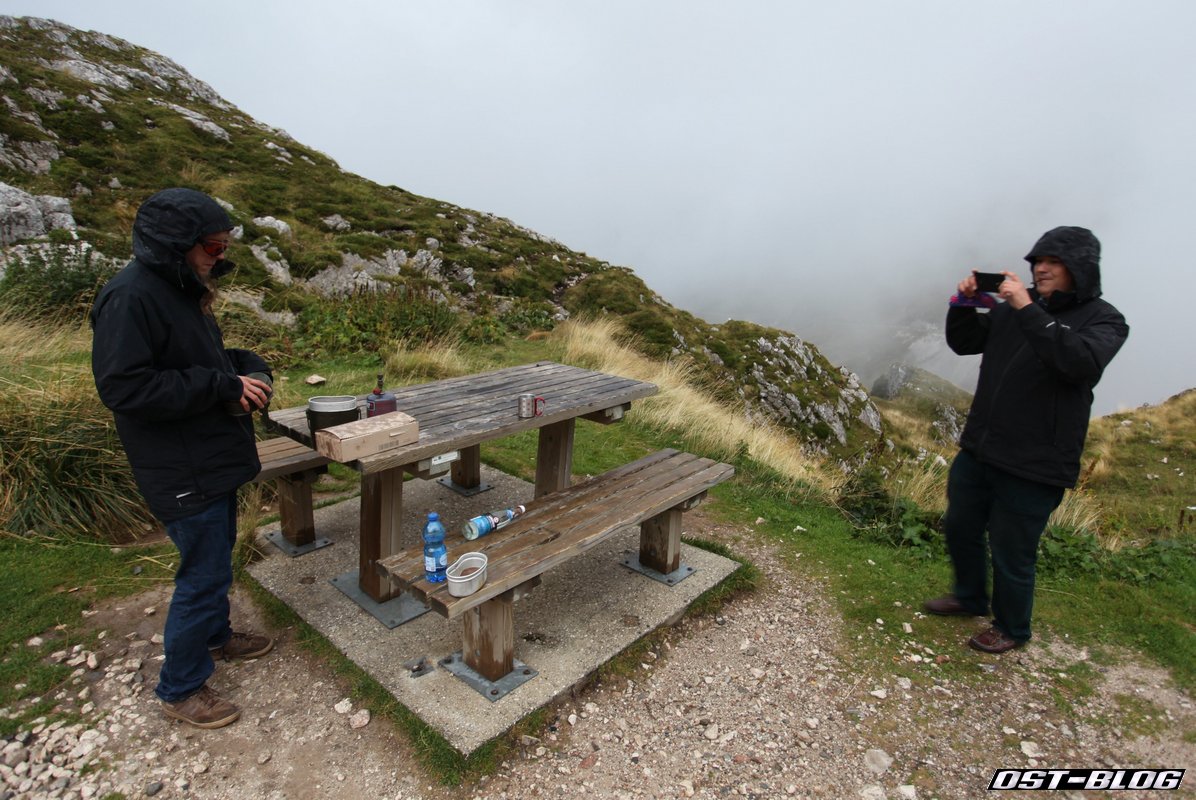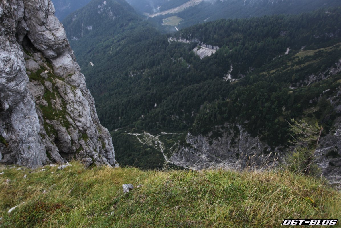 Die Betonung liegt auf etwas. Den Mangart haben wir in seiner ganzen Pracht leider nicht zu sehen bekommen. Auch den Blick über die Felskante, über die hier im Bild die Wolken emporsteigen, brachte uns nur einen Blick in den Wolkennebel. Hier soll etwas teilweise fast senkrecht hinuntergehen und direkt oben auf der Kante liegt schon wieder die Grenze zu Italien.