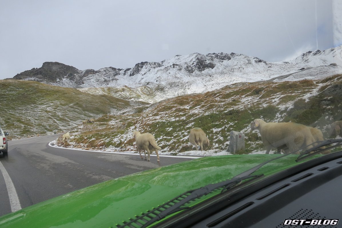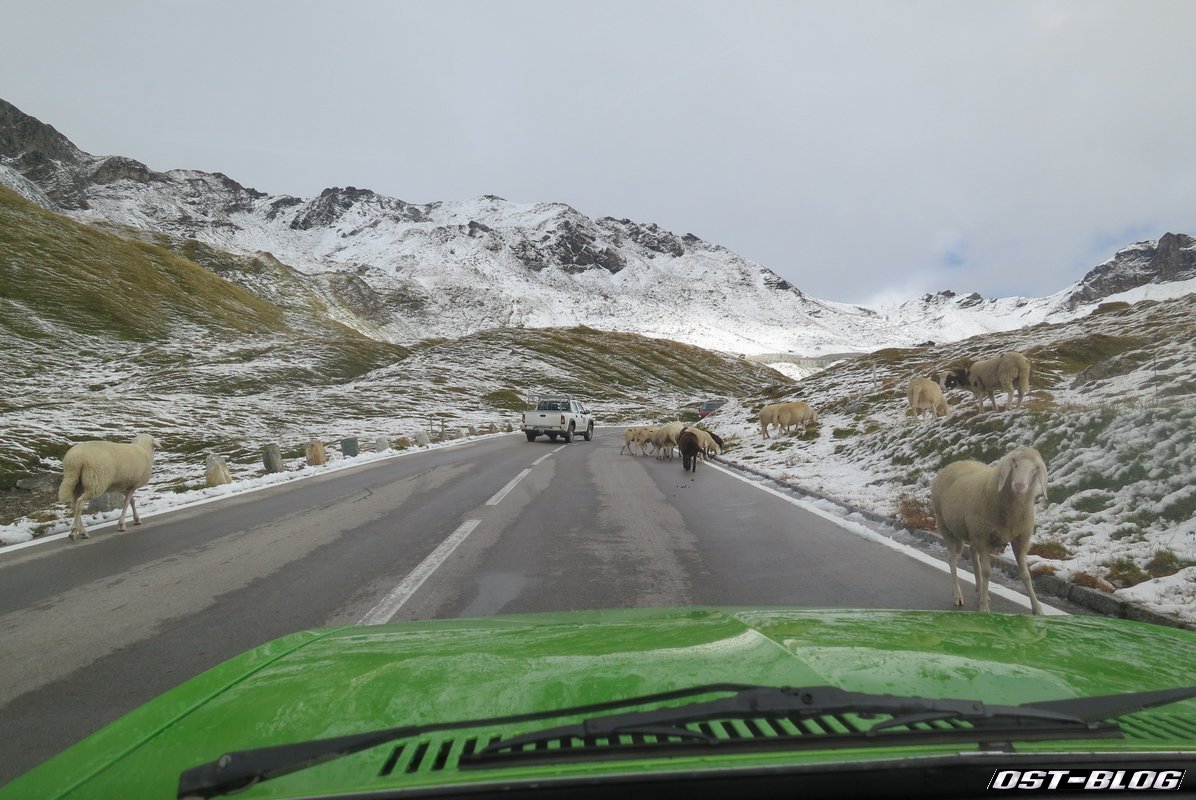 Ich war allerdings nicht so abgelenkt, dass ich die auf der Straße umher trödelnden Schafe nicht bemerkt hatte. Aber wahrscheinlich waren die von der Wetterlage genauso irritiert. Auf jeden Fall meinte ein Schaf mir mal eben direkt vor die Stoßstange springen zu müssen.