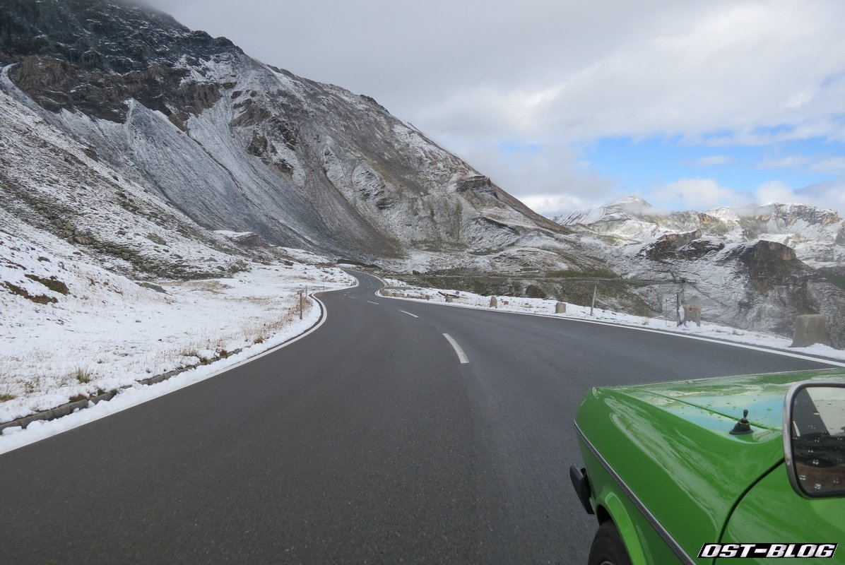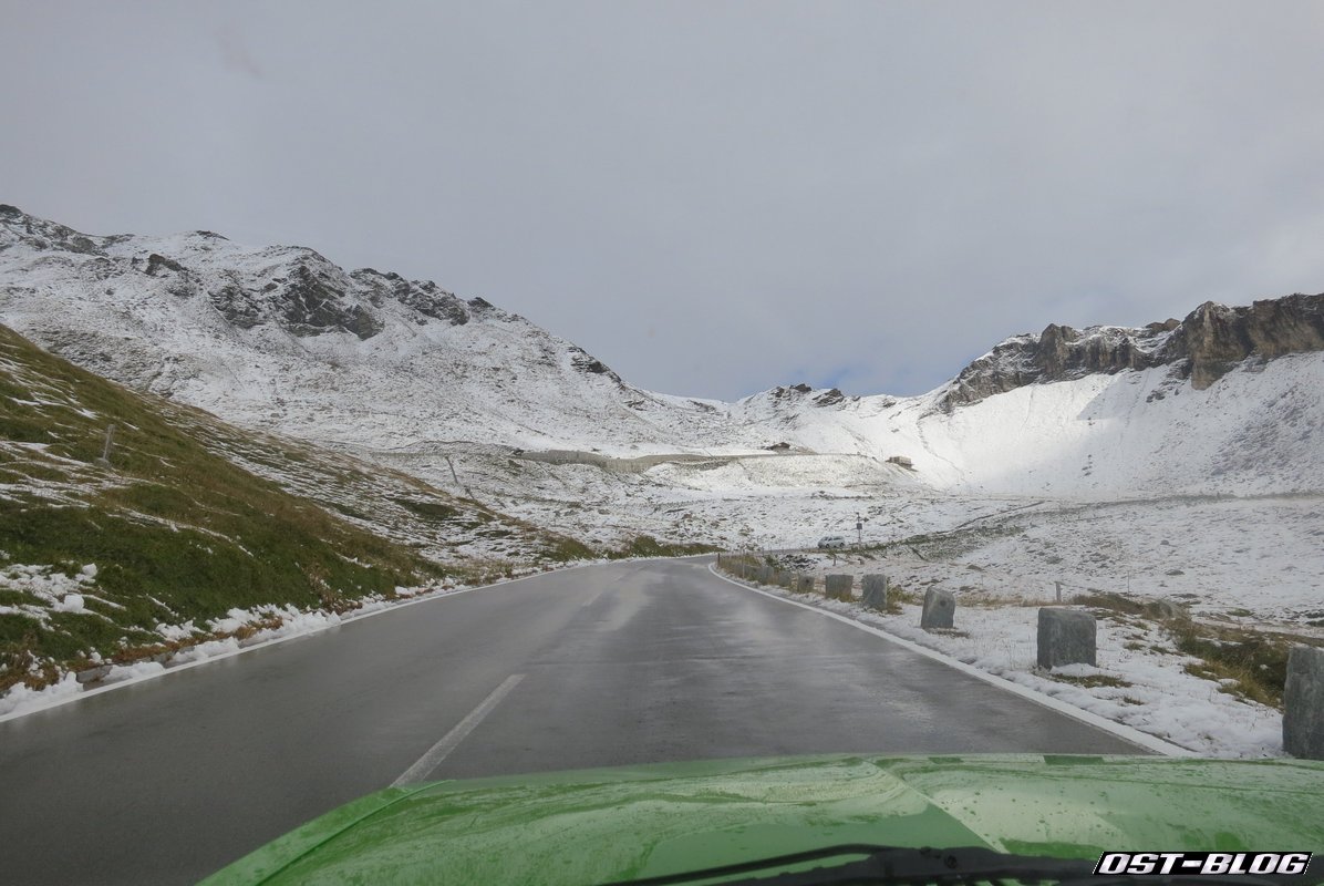 Gegen 10 Uhr starteten wir durch, berappten die 34,50 Euro an der Mautstation und kamen den schneebedeckten Gipfeln immer näher.