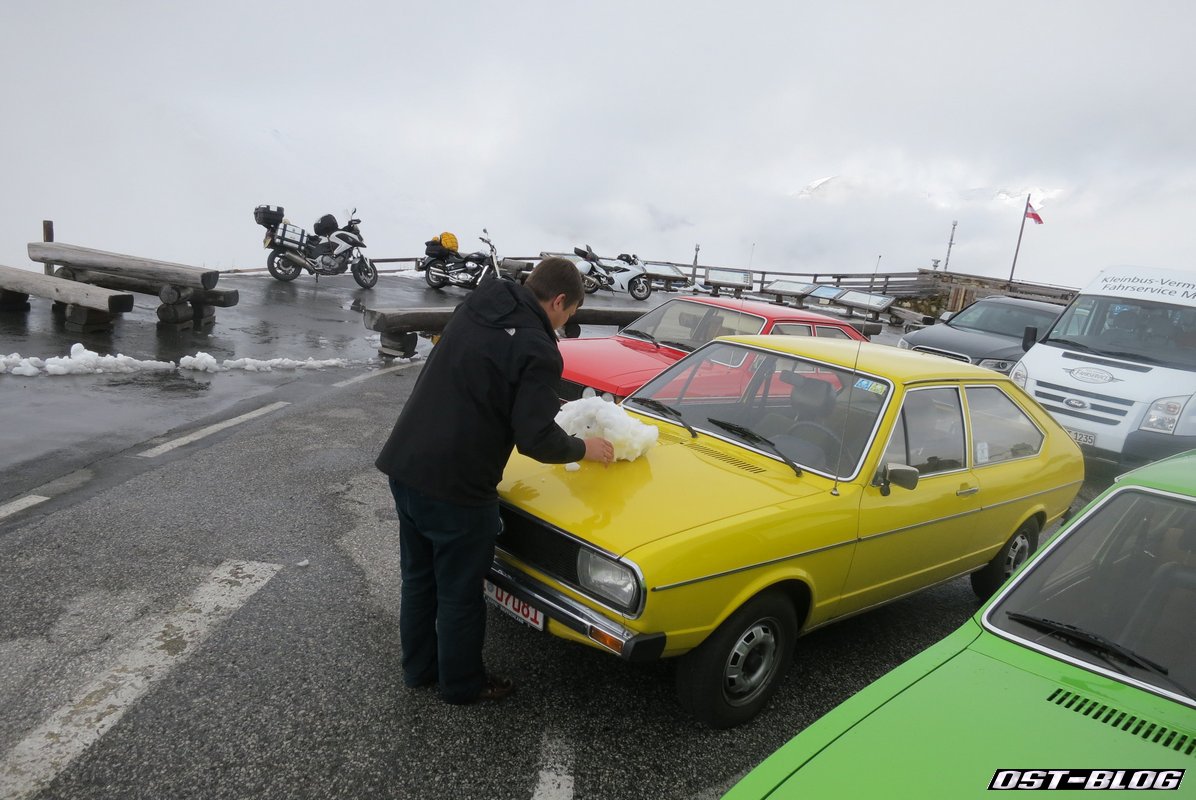 Nach der obligatorischen Kaffeepause haben wir die Edelweißspitze dann wieder Richtung Heiligenblut verlassen. Ein kleinen Stopp haben wir noch für ein paar Fotos im Schnee eingelegt. Bis ich mit meinen italienischen Rennreifen „Rutschiglattifressi“ diesen kleinen Hügel erklommen hatte brauchte es ein paar Anläufe. Julian und Johannes hatten da deutlich weniger Probleme.