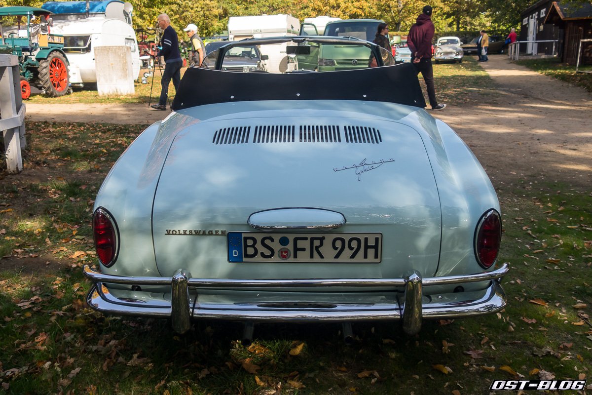 Vermutlich, dass das Nummernschild beim Karmann nicht ganz mittig sitzt, evtl. wegen der Breite (ein „Kuchenblech“ hätte es ja auch getan) – mittig würde das jetzige Nummernschild auch teilweise auf dem „Volkswagen“-Schriftzug aufliegen …